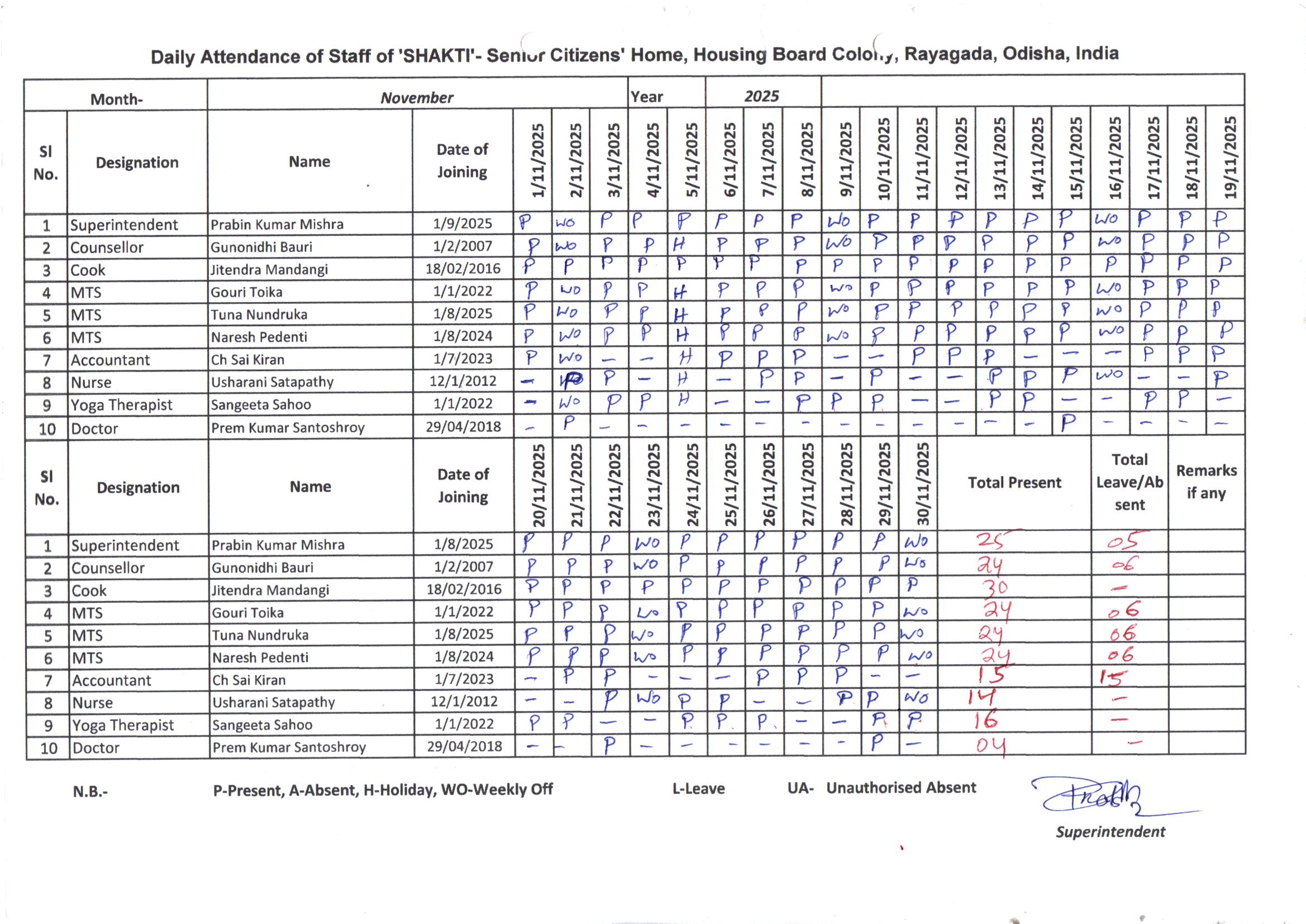| Sl No | Month | Attendance |